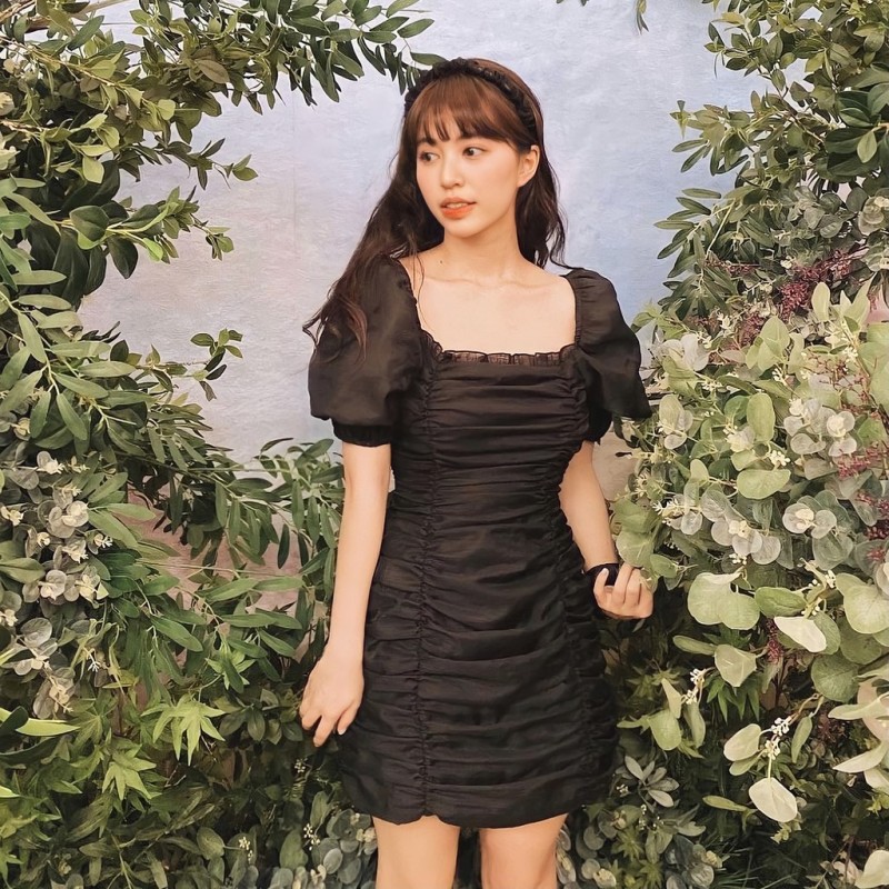 ARIANA DRESS /BL - Fitted Elastic Dress with Two Types of Square Neck, Low Cut Organza with Belt