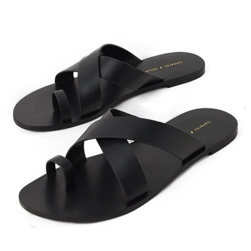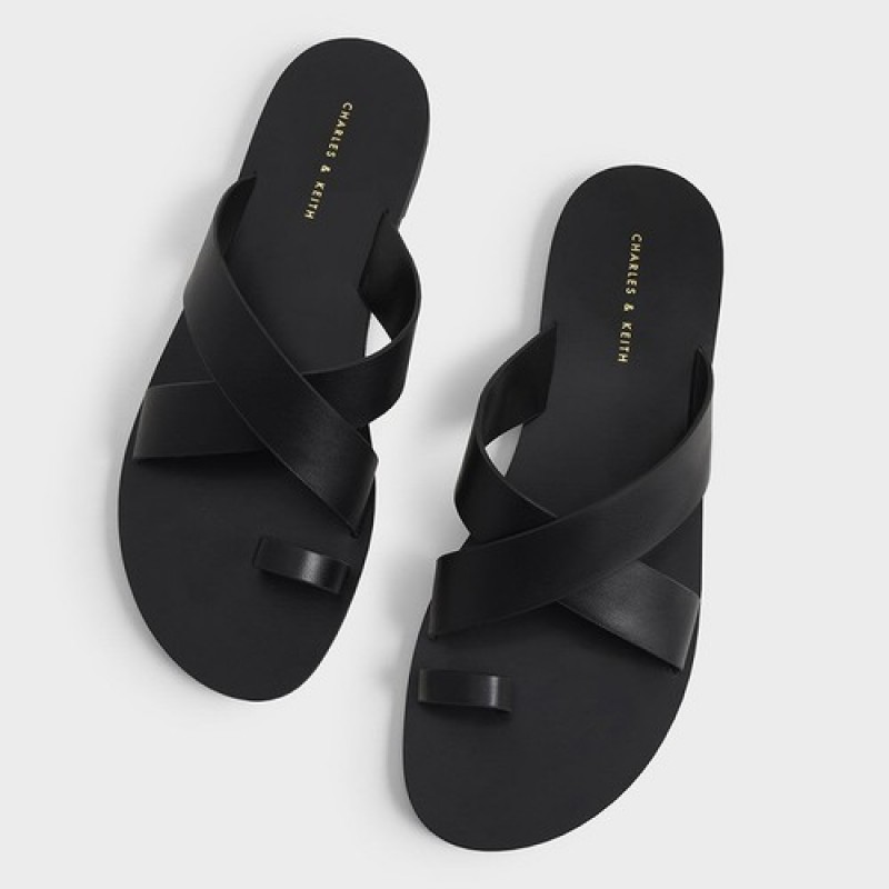 Charles & Keith Toe-Loop Crossover Flats Toe Flip Flops CK1-70060577, Black Color